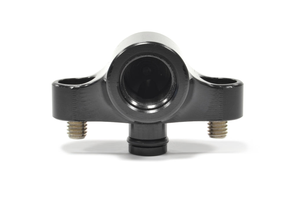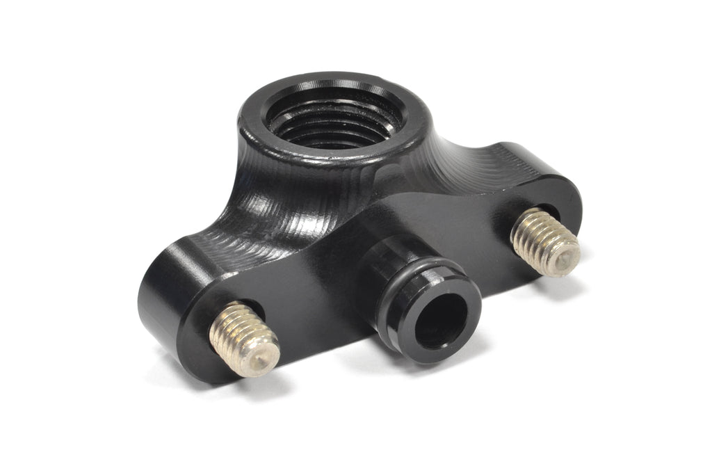 The STM Evo X fuel rail fitting bolts to the stock or an upgraded aftermarket fuel rail with factory style outlet. Our fitting has a -6AN ORB outlet to allow for an aftermarket fuel pressure regulator to be installed. CNC machined in-house and hard anodized black, safe for use with gas, E85 and race fuels. Includes stainless hardware that sits flush with the fitting for a clean install and utilizes an oring for a leak-proof connection to your fuel rail.